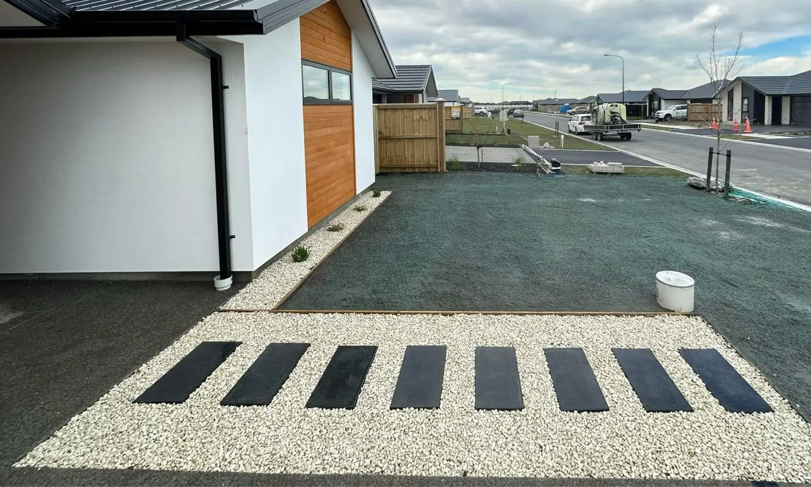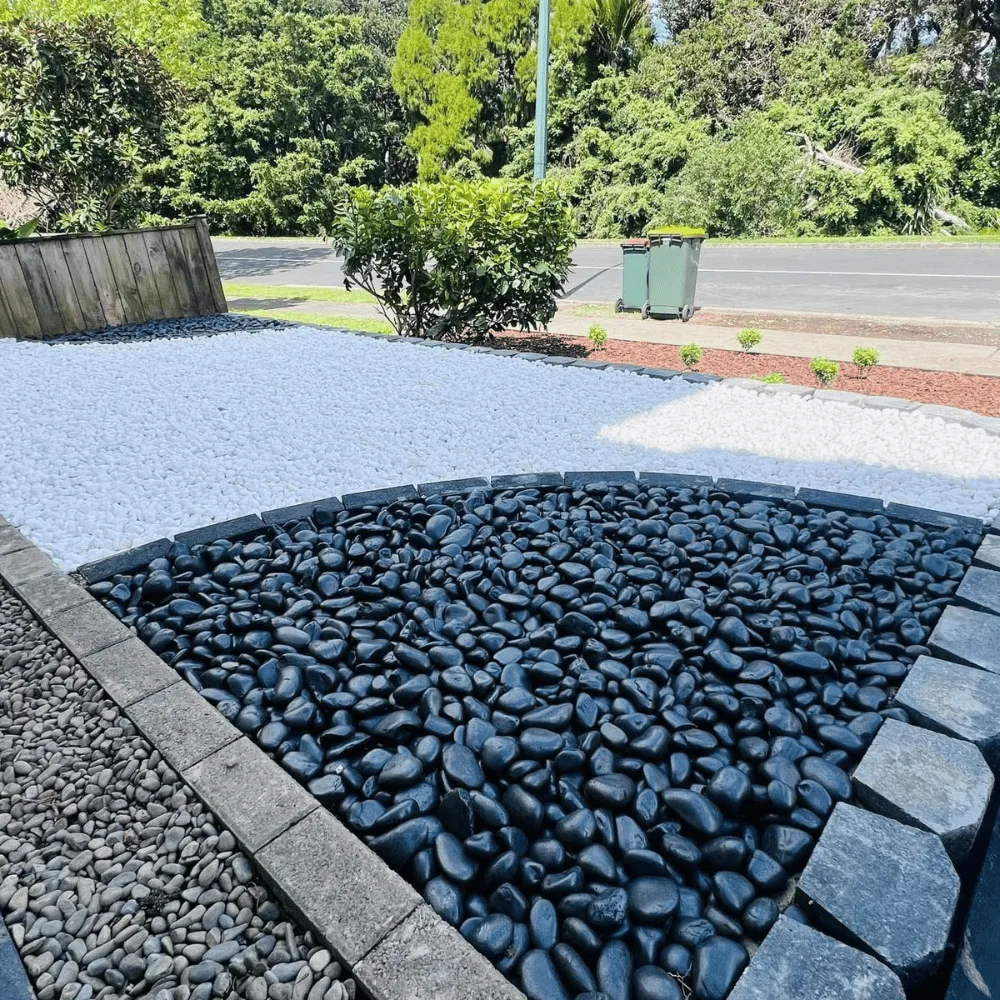 This modern front yard design uses a striking contrast of black, white, and grey decorative pebbles, bordered with clean stone edging to create a low-maintenance and visually appealing landscape. The layout not only enhances curb appeal but also promotes a clean, organized outdoor environment without the need for grass or heavy upkeep.